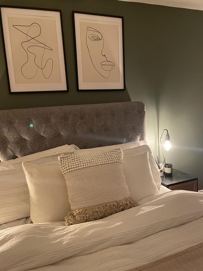 A dark green feature wall was added to the master bedroom, Ellie also opted for bespoke cushions which I designed. Along with a bespoke Scandinavian style poufy to work in the living room or bedroom. The poufy also working as additional storage.